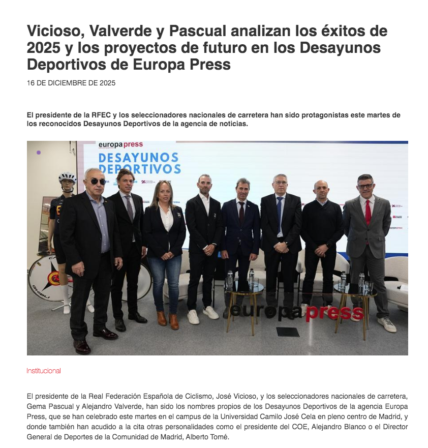 La noticia tuvo una amplia repercusión mediática y situó a nuestra localidad en el escaparate nacional. Junto al presidente de la Federación de Ciclismo intervinieron los seleccionadores de carretera Alejandro Valverde y Gema Pascual. Al encuentro, que se produjo el 16 de diciembre en el campus de la UCJC de Madrid dentro de los Desayunos Deportivos de Europa Press, asistieron entre otros el presidente del COE, Alejandro Blanco, el Dir. Gral. de Deportes de la CAM, Alberto Tomé, y el alcalde de Vva. del Pardillo, Eduardo Fernández Navarro.