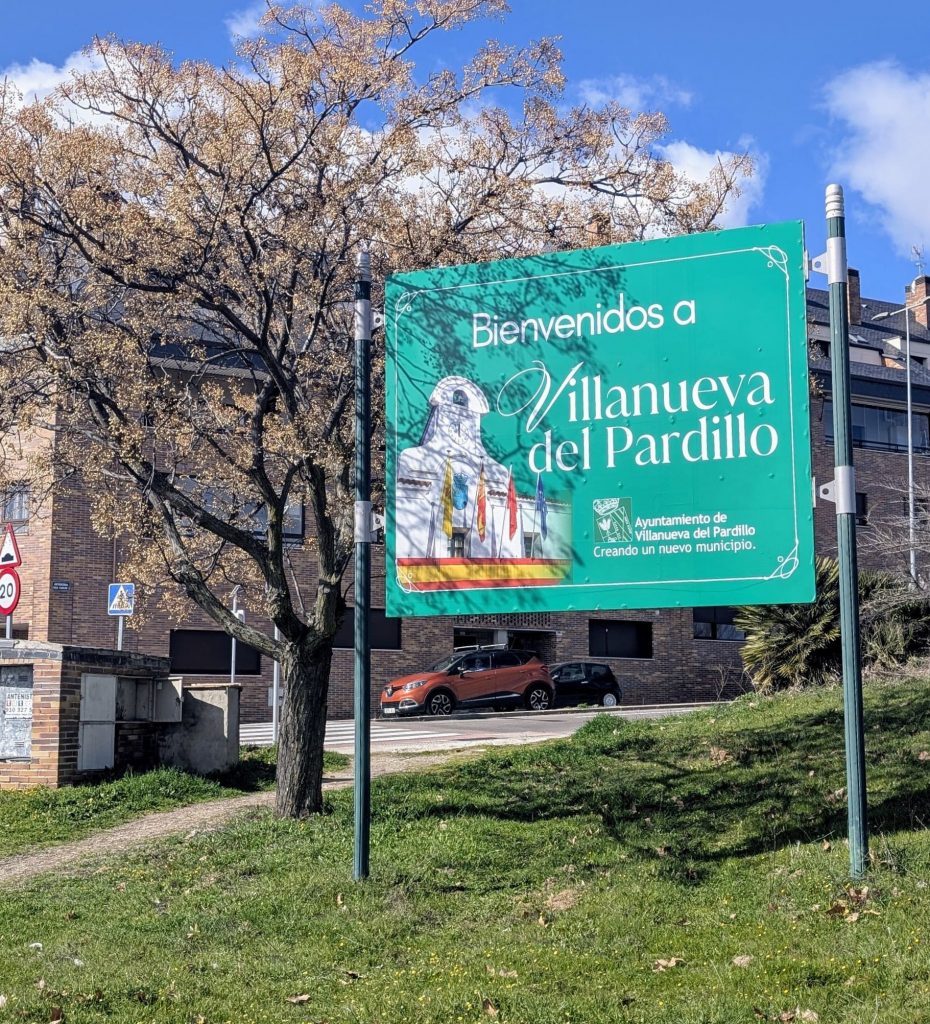 Marzo 2025 / Es la imagen de los actuales carteles de bienvenida a Vva. del Pardillo. En el pleno de enero y a pregunta de Vox, la concejala Sonia Cirvián indicó que el coste de su sustitución estaba incluido en el contrato de mobiliario urbano, que los primeros se instalaron en 2012 y que no pueden iluminarse porque es competencia de Carreteras, al igual que el agua de las fuentes de las rotondas.