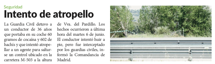 Detenido tras intentar atropellar a un guardia civil en la M-503 para saltarse un control Publicado por R | Jun 30, 2023 | Seguridad, Sucesos | 0 | Julio 2023 / Junio