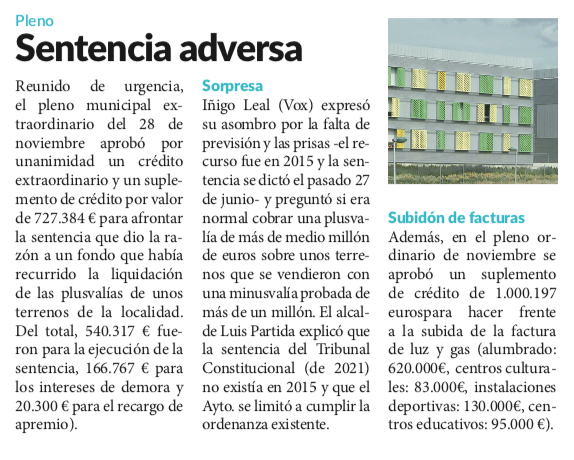 El Ayto. villanovense prepara 727.000 €  para abonar la sentencia adversa por una liquidación de plusvalías