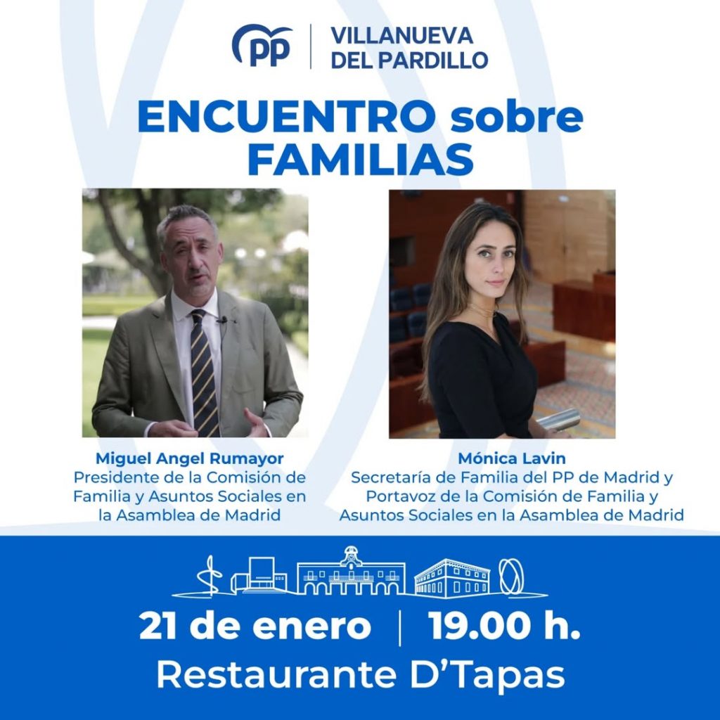 El PP de Vva. del Pardillo organizó el 21 de enero en el Bar D´Tapas la charla “Encuentro sobre Familias” con diversas ponencias relacionadas con la vida, la familia y la solidaridad. Asistieron Miguel Ángel Rumayor, presidente de la Comisión de Familia y Asuntos Sociales, y Mónica Lavín, portavoz de la Comisión de Familia del Grupo Parlamentario de la Asamblea de Madrid.
