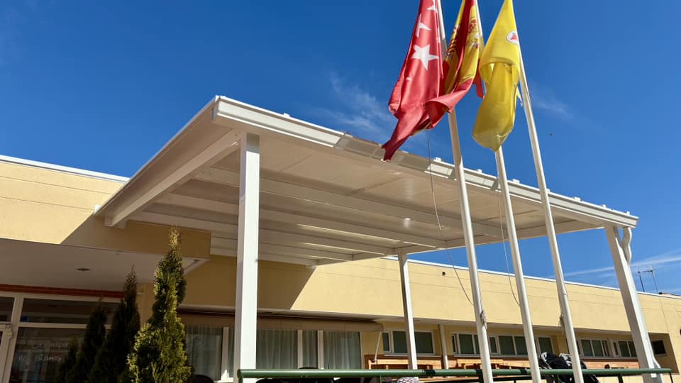 La entrada de la Escuela Infantil Municipal Virgen del Soto luce así tras las obras realizadas por el Ayto. Además de la pérgola, se instalaron un protector de chapa y un canalón y se pintó el muro del patio. La inversión fue de 22.331 €.
