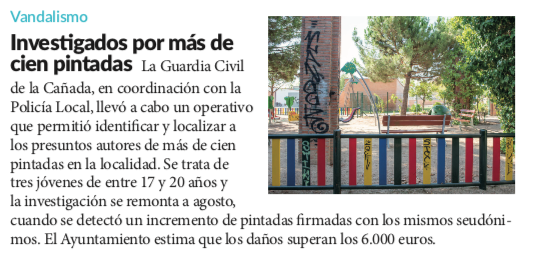 Presuntos autores de más de cien pintadas en la Cañada Publicado por R | Ene 9, 2023 | Sucesos, Villanueva de la Cañada | 0 | Enero 2023 /